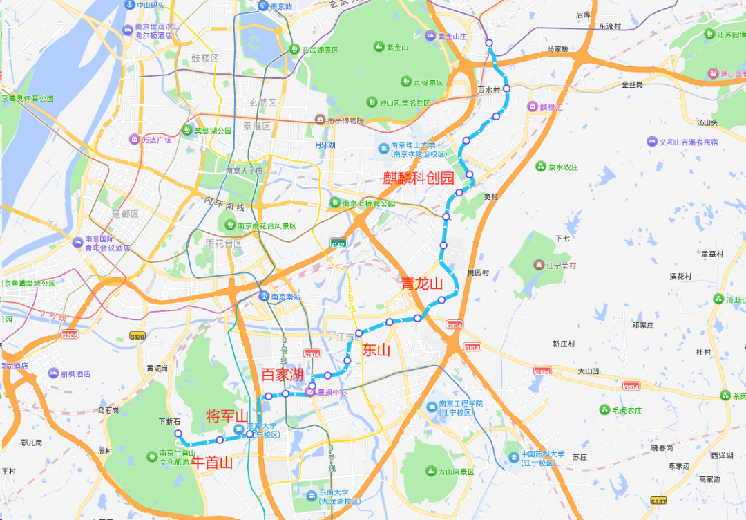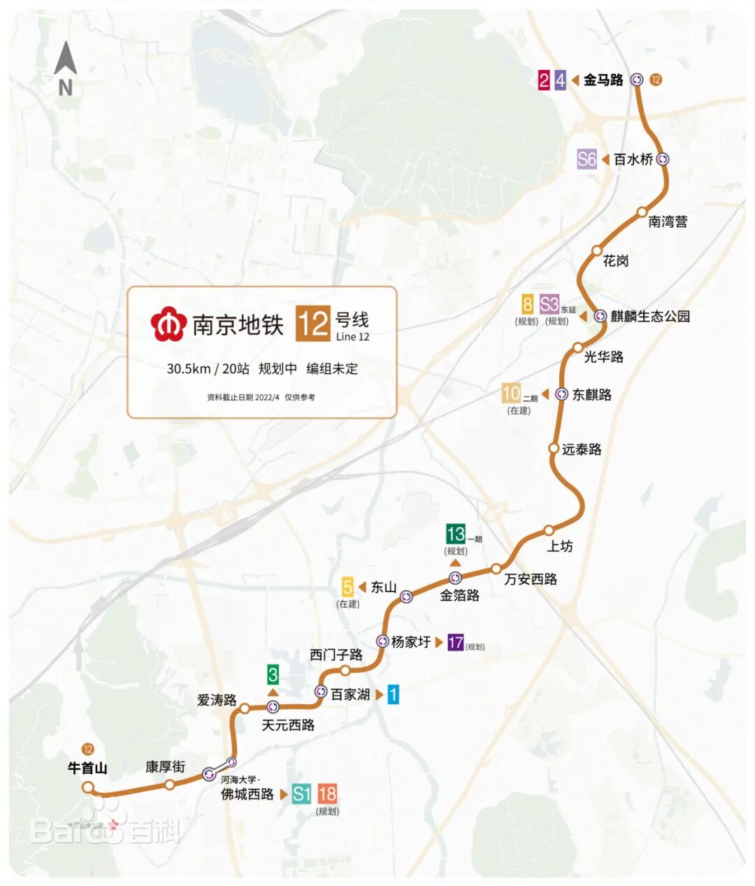 根据前期规划,地铁12号线全长约30千米,规划设20个站点,线路由金马路向南经麒麟科创园至上坊,再向西穿过东山、百家湖、将军山,最终抵达牛首山。