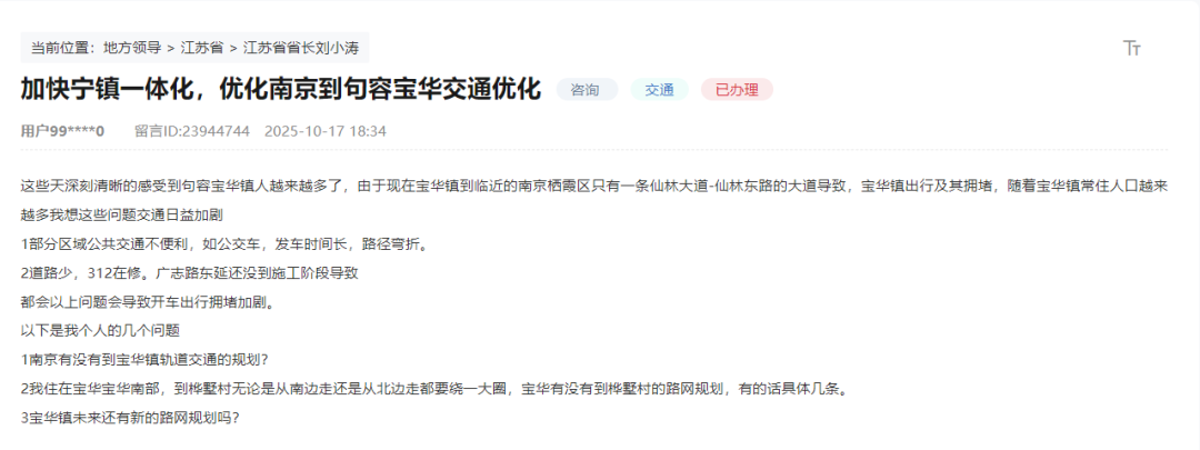网友对加快宁镇一体化,优化南京到句容宝华交通提出了意见,其中问到南京有没有到宝华镇轨道交通的规划?