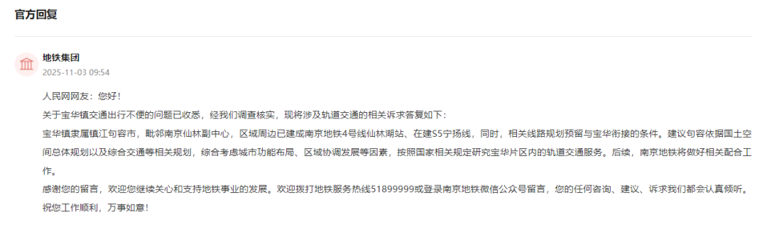 随后南京地铁给出回复:宝华镇隶属镇江句容市,毗邻南京仙林副中心,区域周边已建成南京地铁4号线仙林湖站、在建S5宁扬线,同时,相关线路规划预留与宝华衔接的条件。建议句容依据国土空间总体规划以及综合交通等相关规划,综合考虑城市功能布局、区域协调发展等因素,按照国家相关规定研究宝华片区内的轨道交通服务。后续,南京地铁将做好相关配合工作。