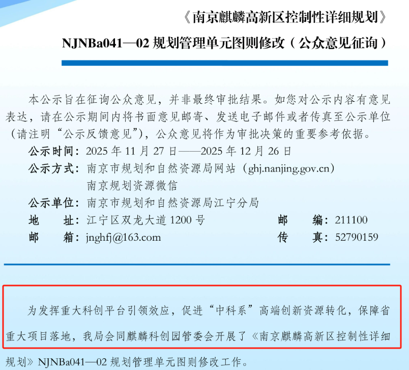 11月27日,在南京自然资源规划局官网,发布了一条《南京麒麟高新区控制性详细规划》NJNBa041—02规划管理单元图则修改(公众意见征询)信息。