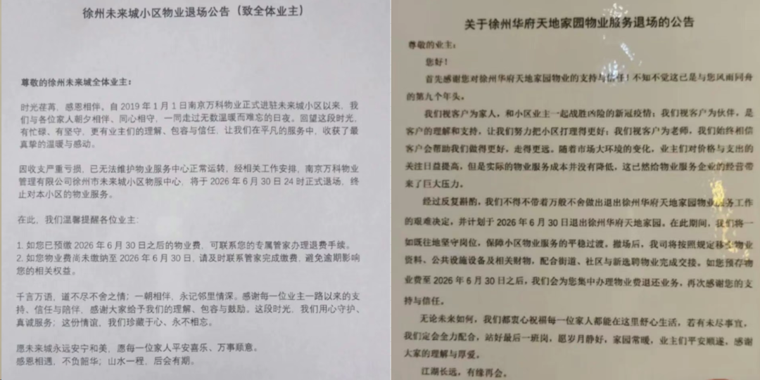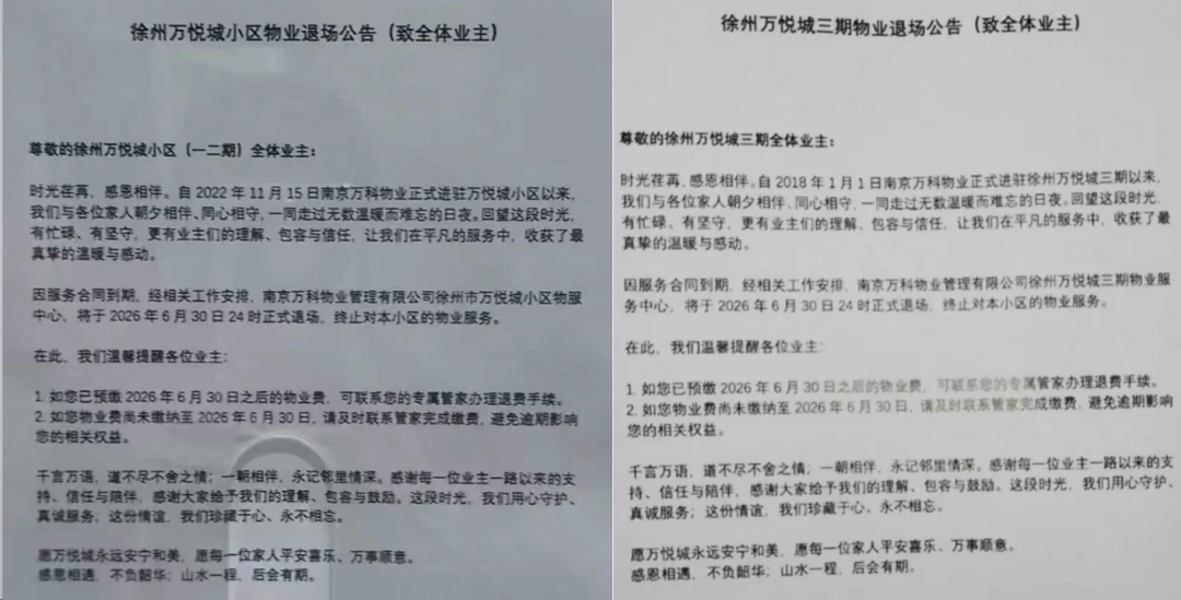 根据退场公告,南京万科物业将于2026年6月30日24时起,正式终止对徐州万悦城(一、二、三期)、未来城、华府天地家园、水润峰境、云湖明庐6个住宅项目的物业服务。