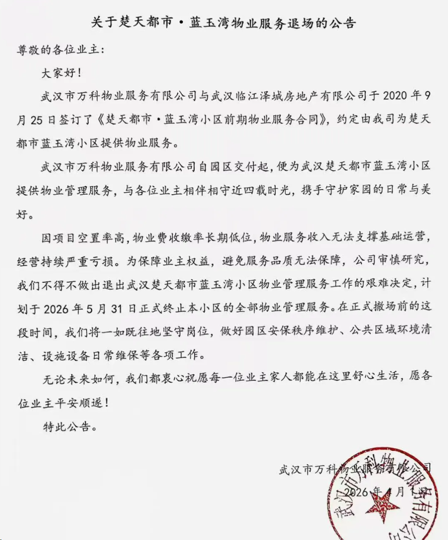 4月1日,武汉万科物业宣布:因项目空置率高、物业费收缴率长期低位导致持续亏损,计划于2026年5月31日退出武汉新洲区楚天都市·蓝玉湾小区的物业服务。