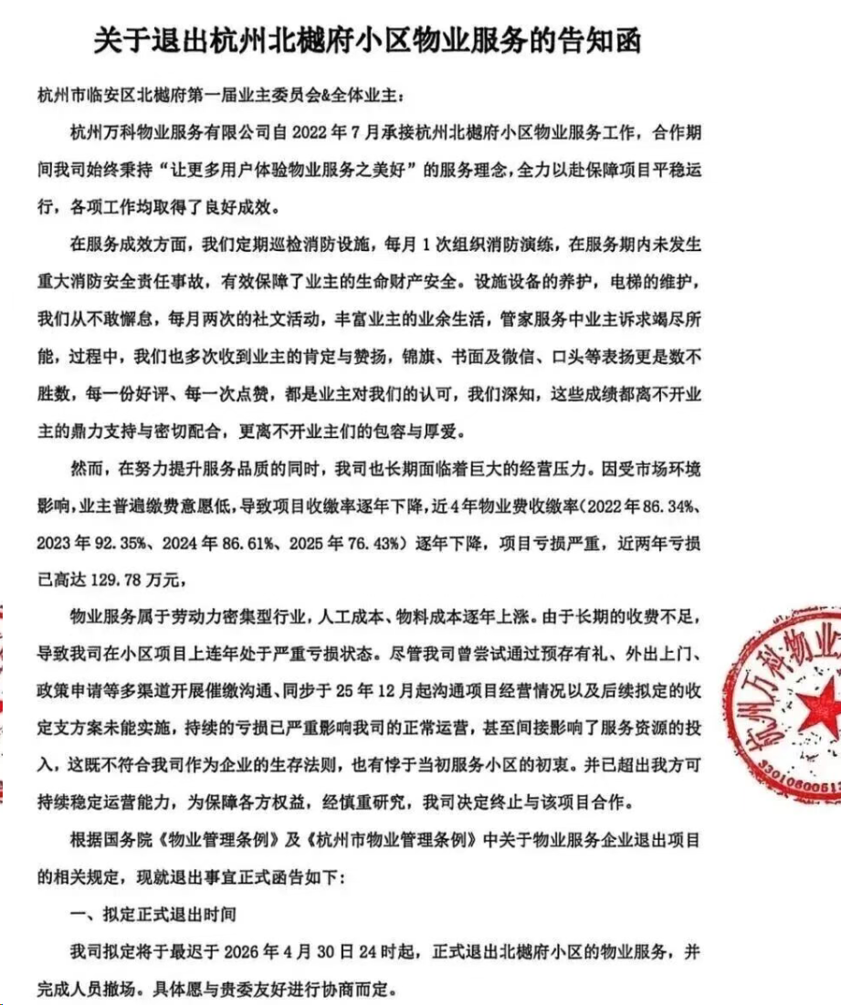 3月21日,杭州万科物业宣布:因长期严重亏损拟于2026年4月30日24时正式撤出杭州北樾府小区。